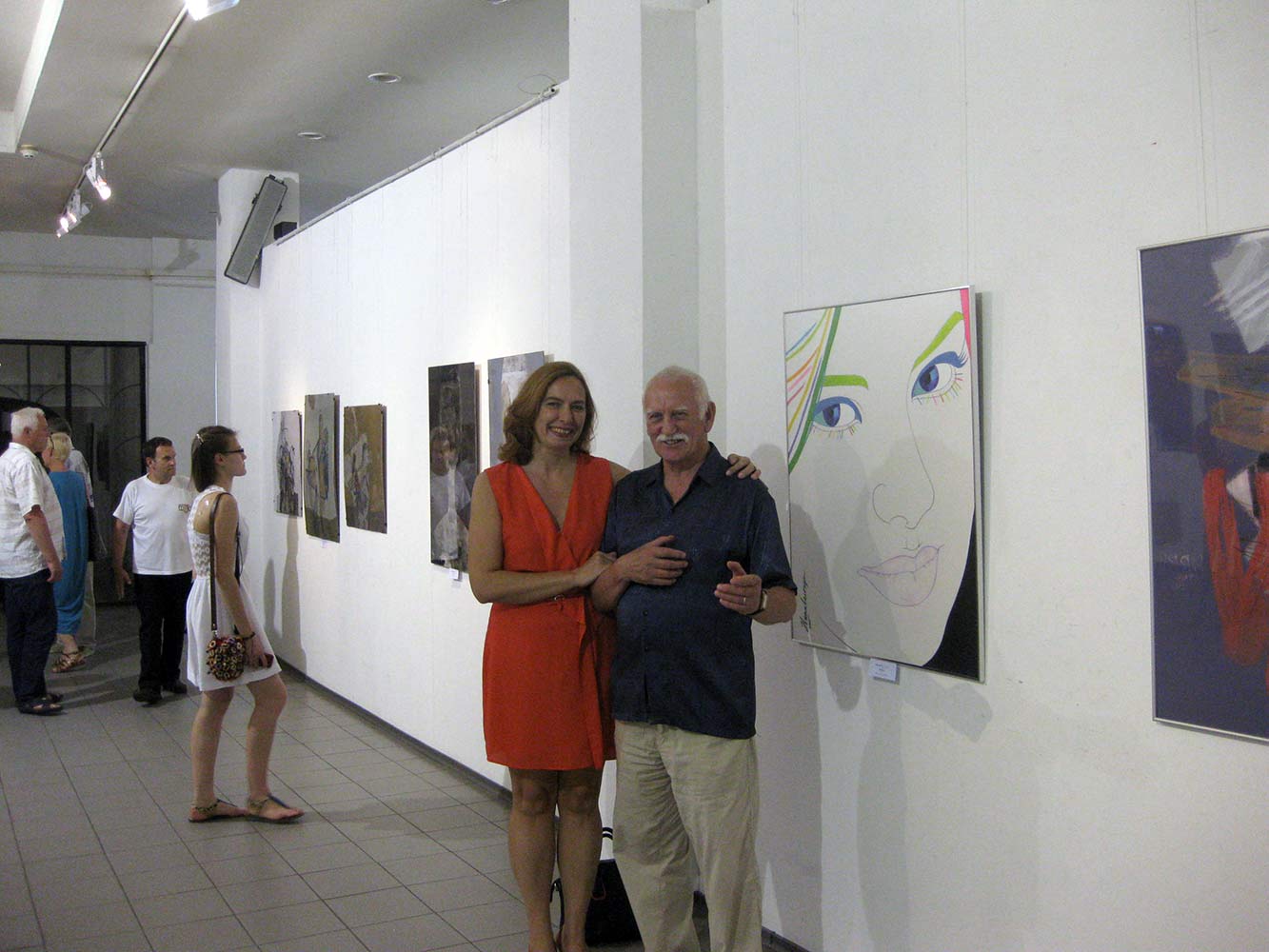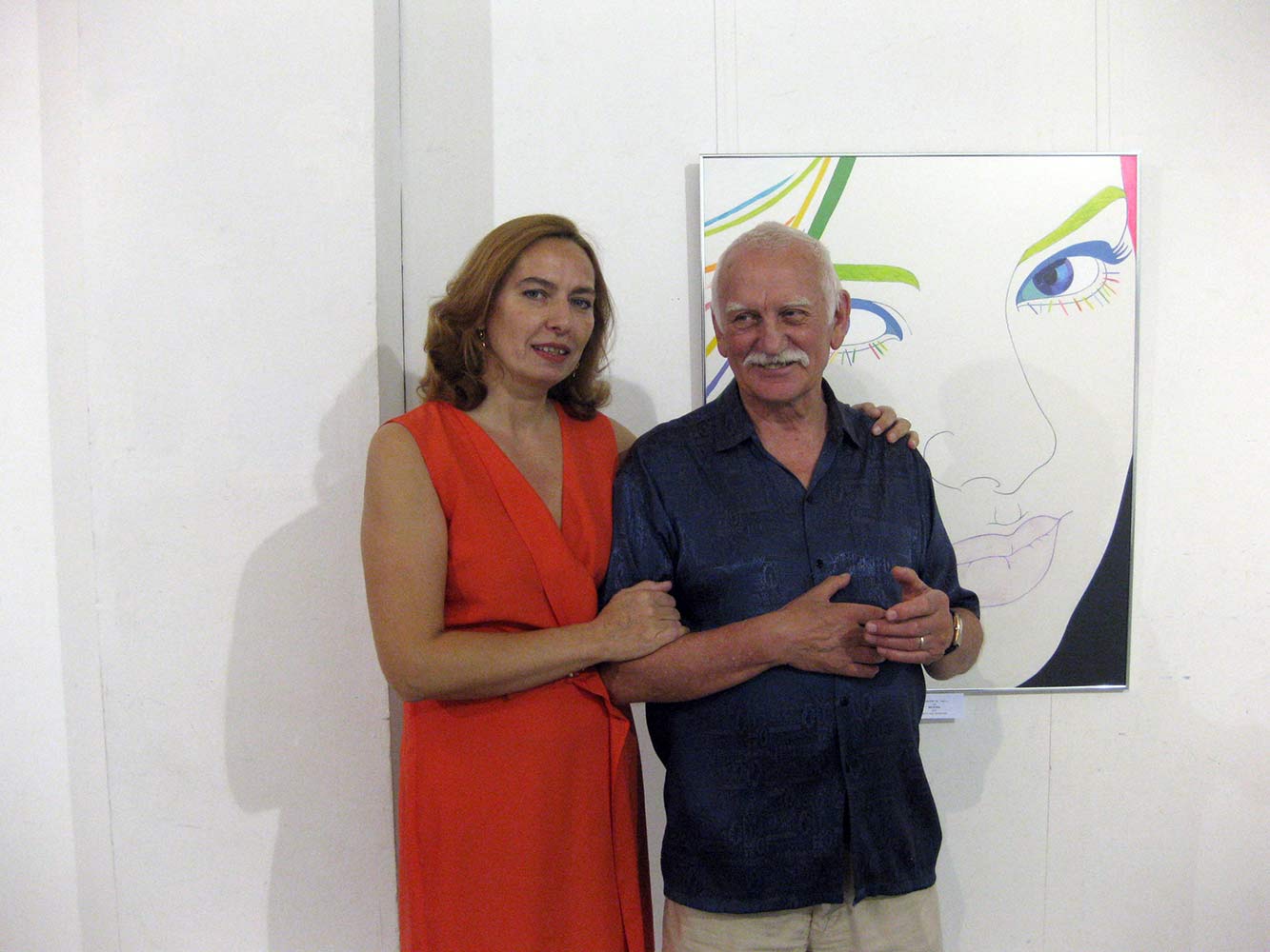Наталка Тимошенко з чоловіком на тлі його твору під час презентації Всеукраїнської Трієнале Графіки |
